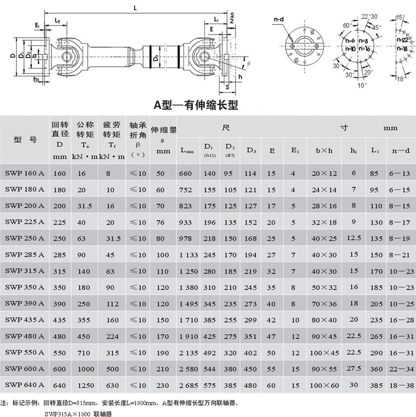 Kh——萬向聯軸器的軸承壽命修正系數 K ——萬向聯軸器的兩軸線折角修正系數 Ka——載荷修正系數。載荷均勻,工作平穩時,Ka=1.0;載荷不均勻,中等沖擊時,Ka=1.1~1.3;較大沖擊載荷和頻繁正反轉時,Ka=1.3~1.5,特大沖擊載荷和頻繁正反轉時Ka>1.5。 對于轉速高、折角大或其長度超出規定的萬向聯軸器,除按上述計算處,還必須驗算其轉動靈活性,轉動靈活性用n 表示,一般情況下:n >18000。 式中 ——萬向聯軸器的軸線折角,(°);n——萬向聯軸器的轉速,r/min.